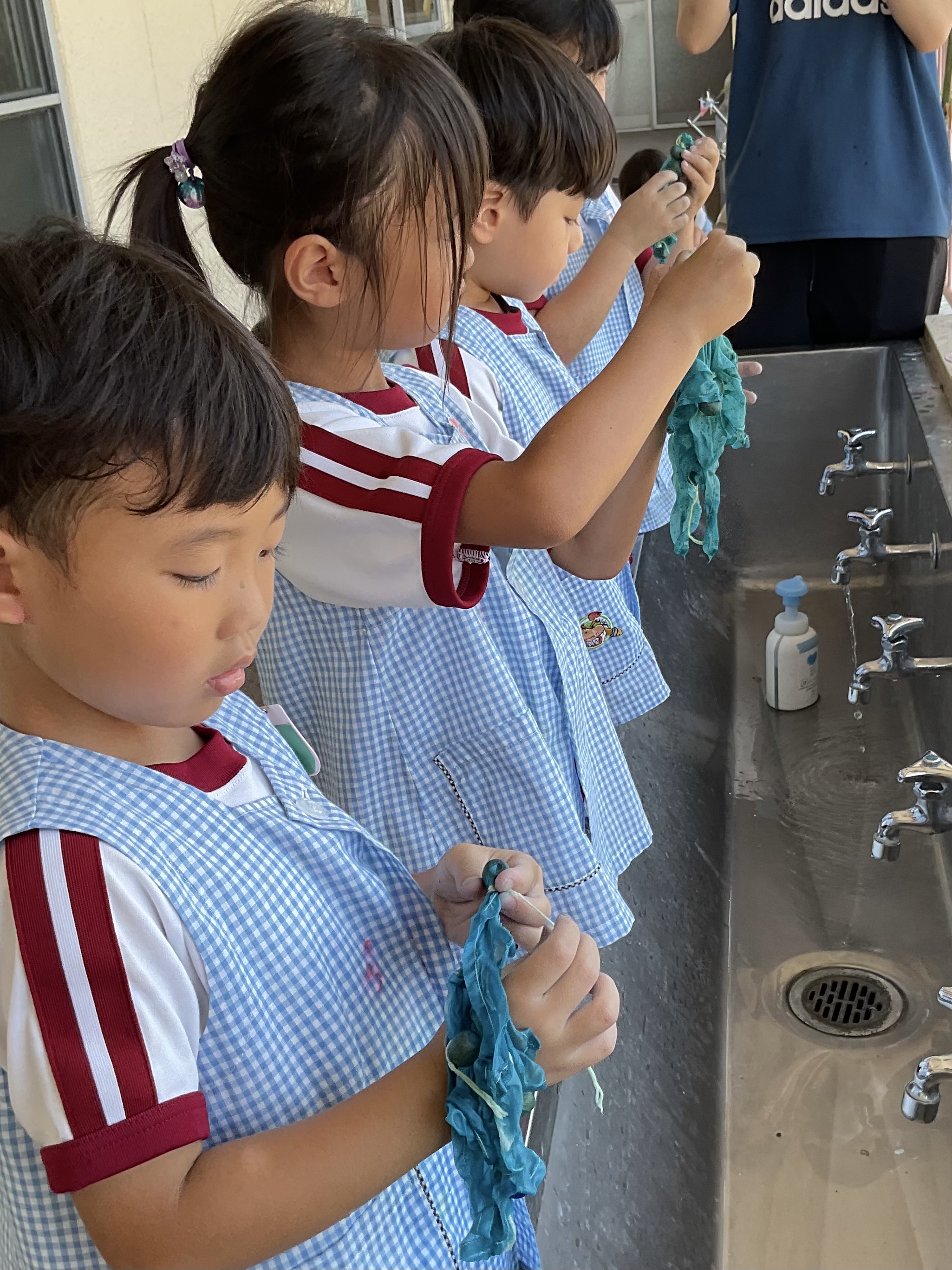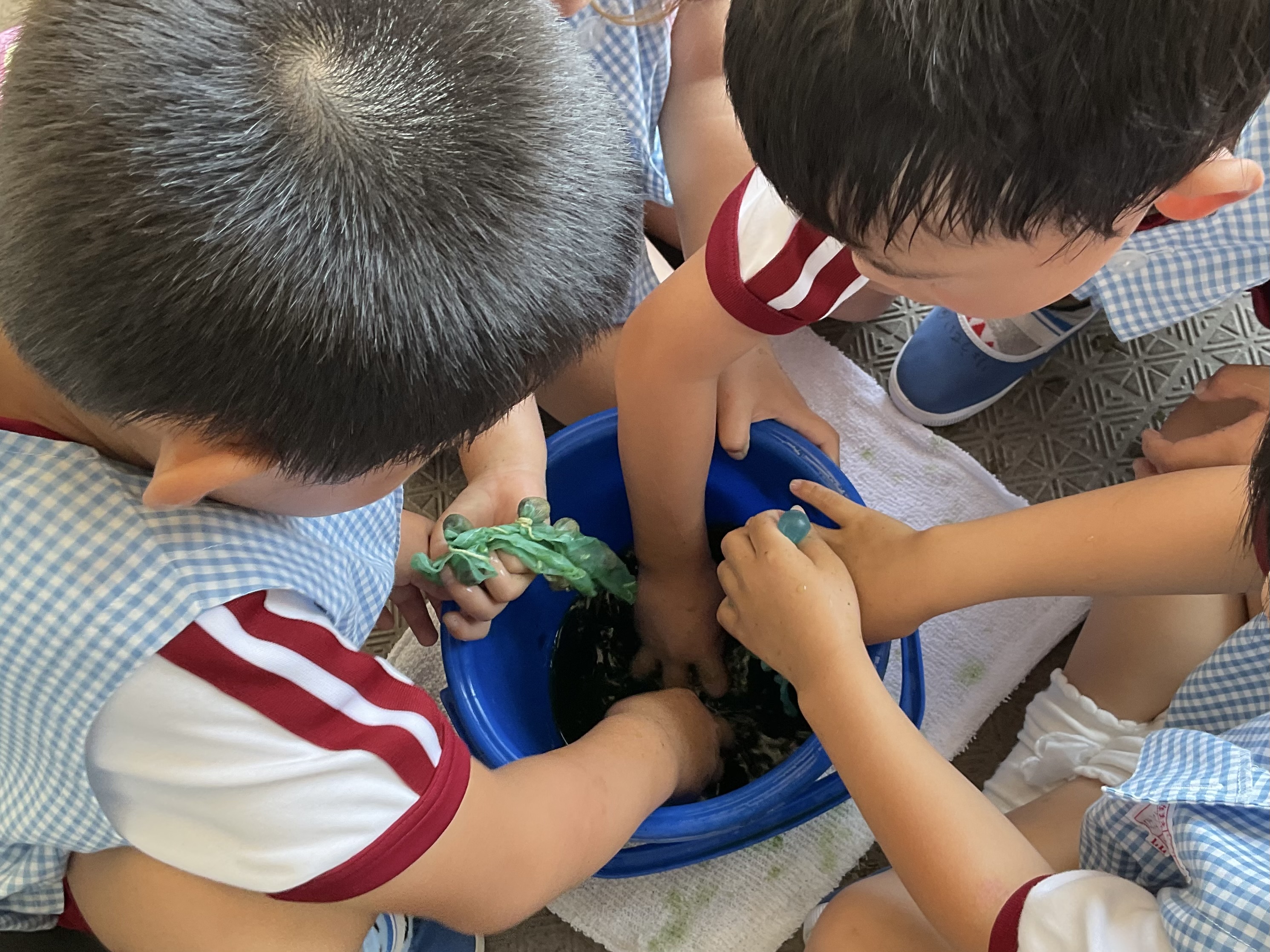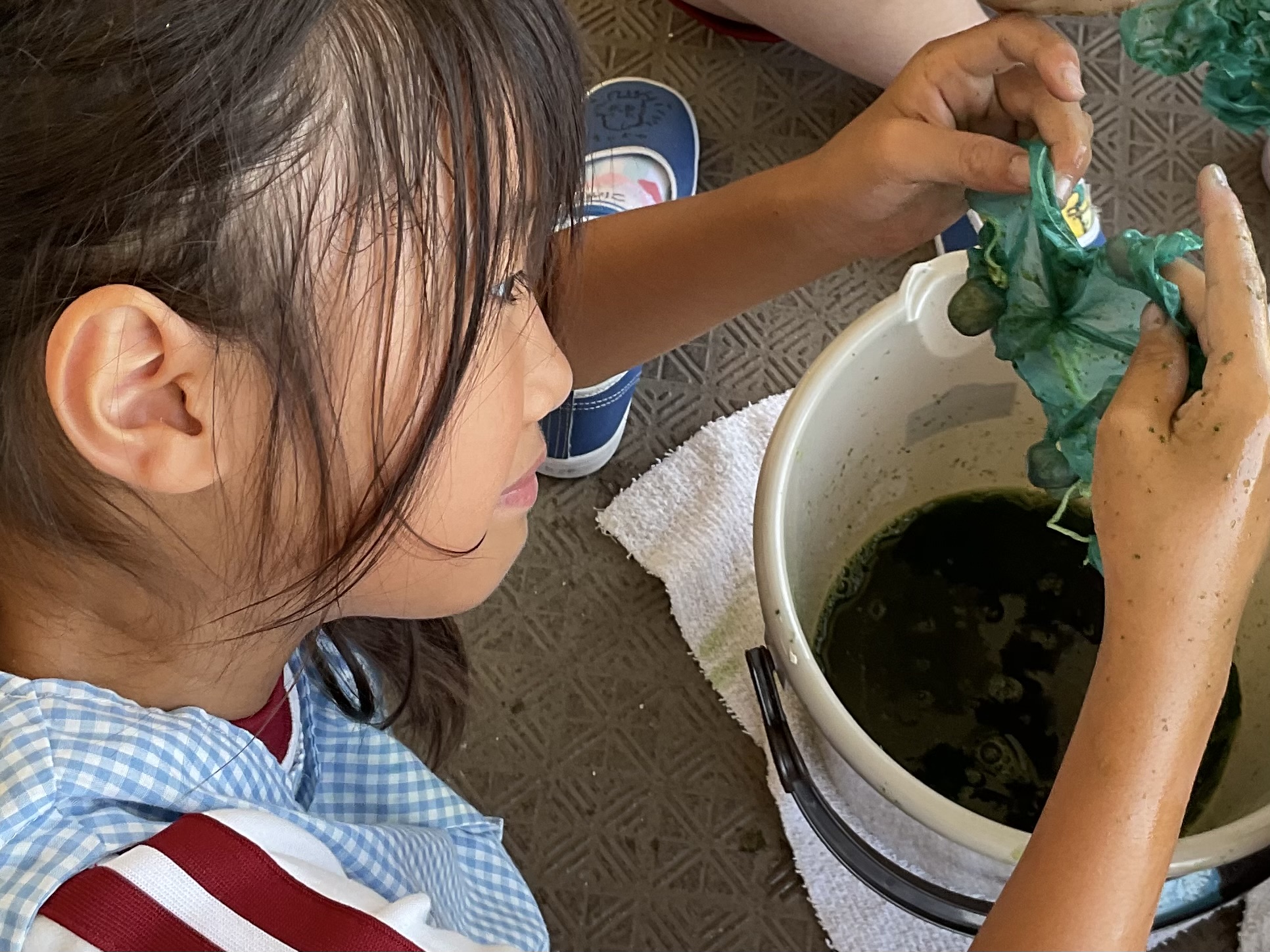 「青くなって来た~」「白い模様が出てきた~」子どもたちの驚きの声が聞こえてきました。本当に不思議!緑なのにいつの間にか青に変わって行きます。