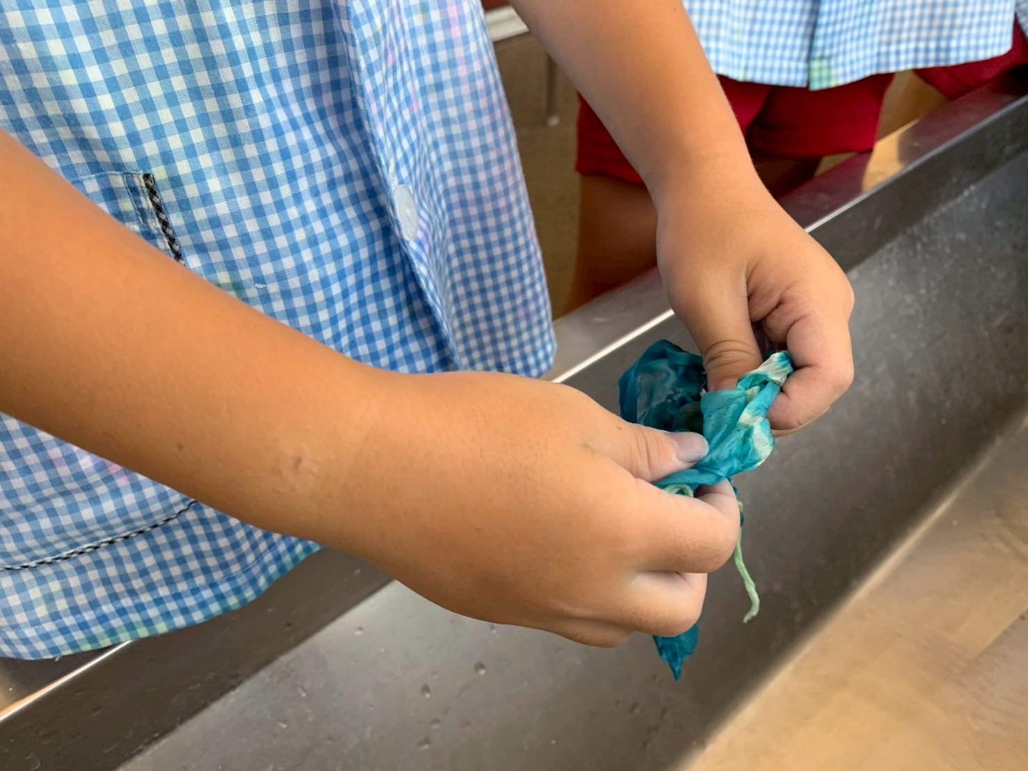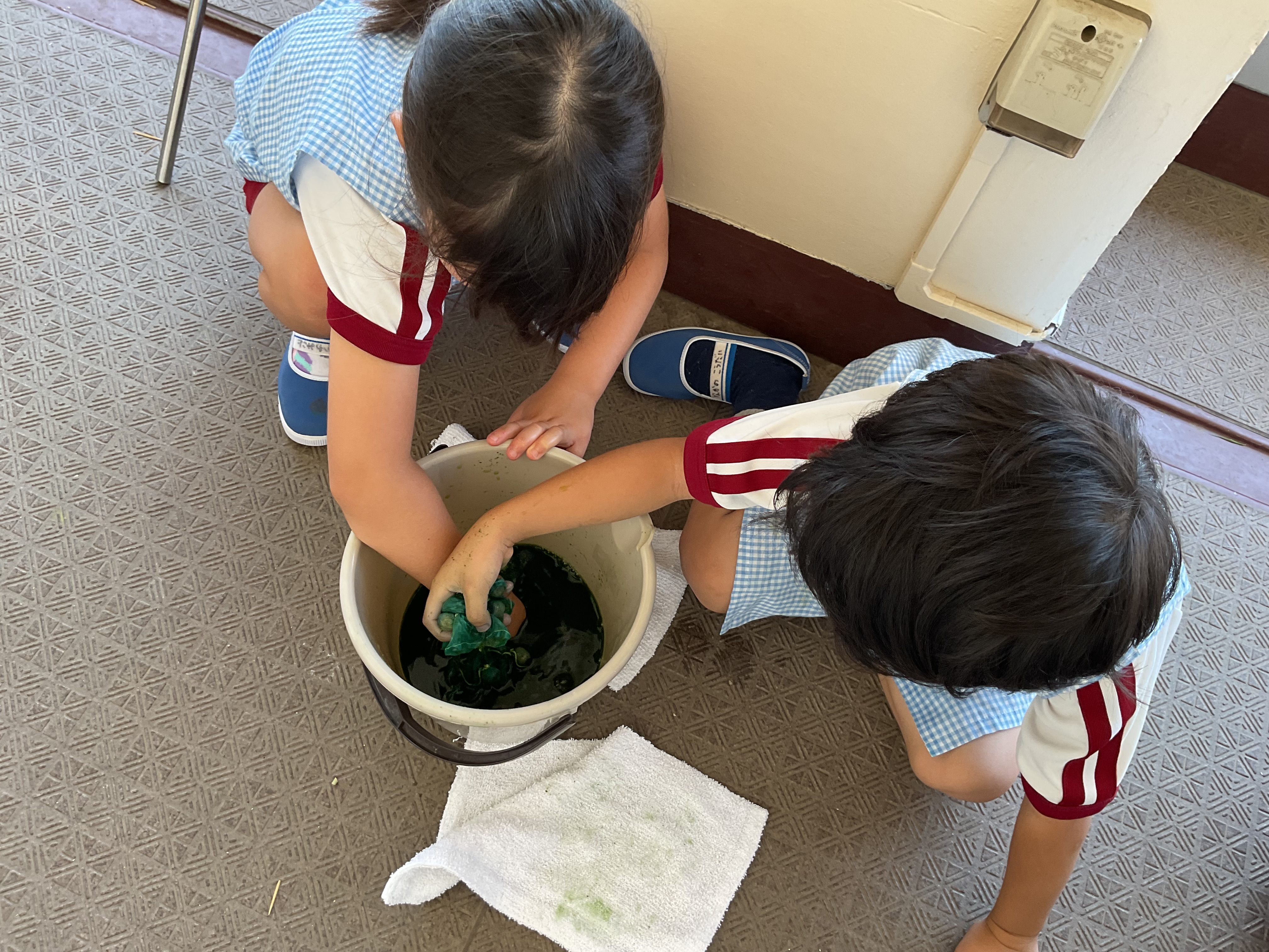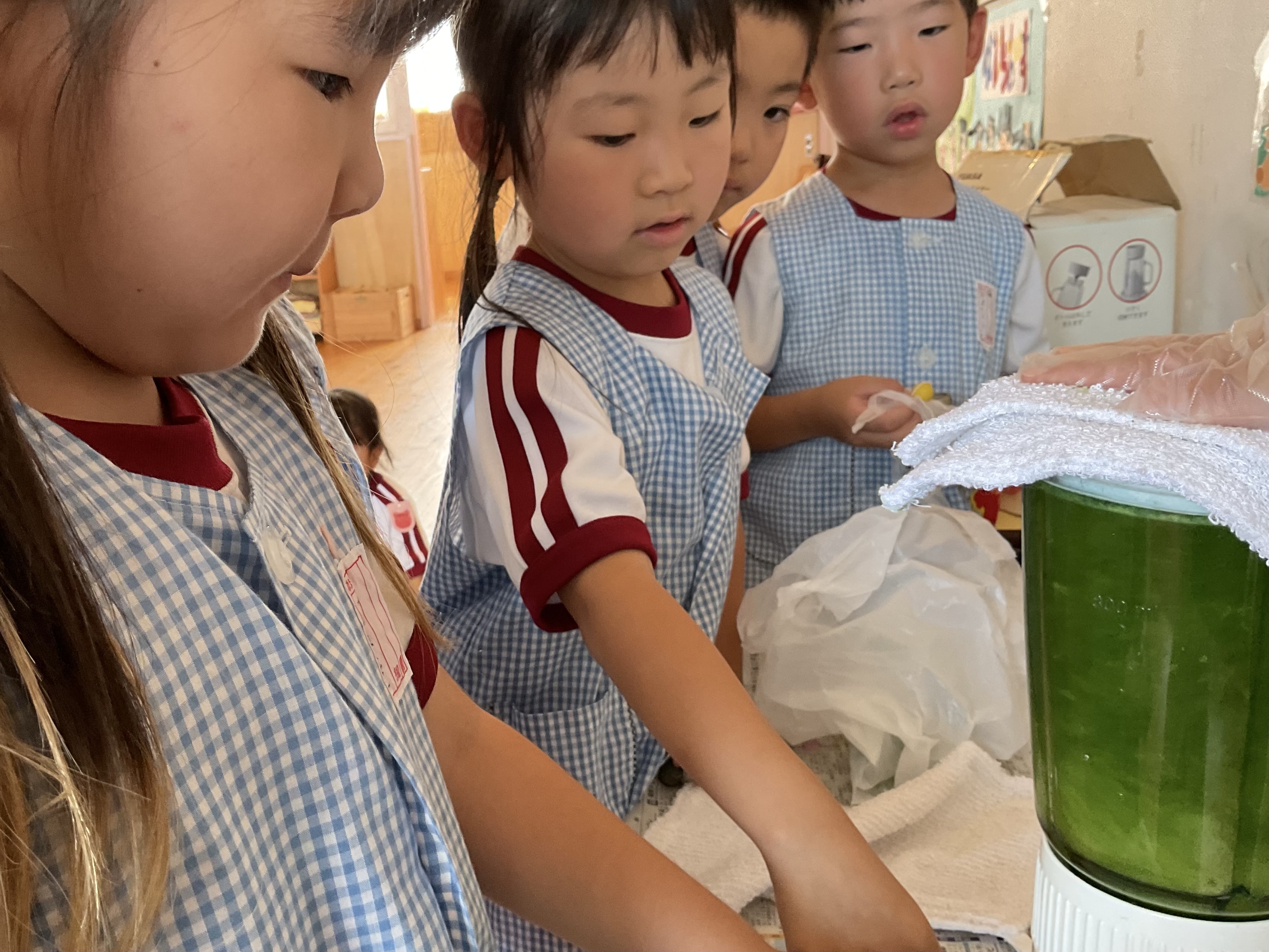 「青くなって来た~」「白い模様が出てきた~」子どもたちの驚きの声が聞こえてきました。本当に不思議!緑なのにいつの間にか青に変わって行きます。