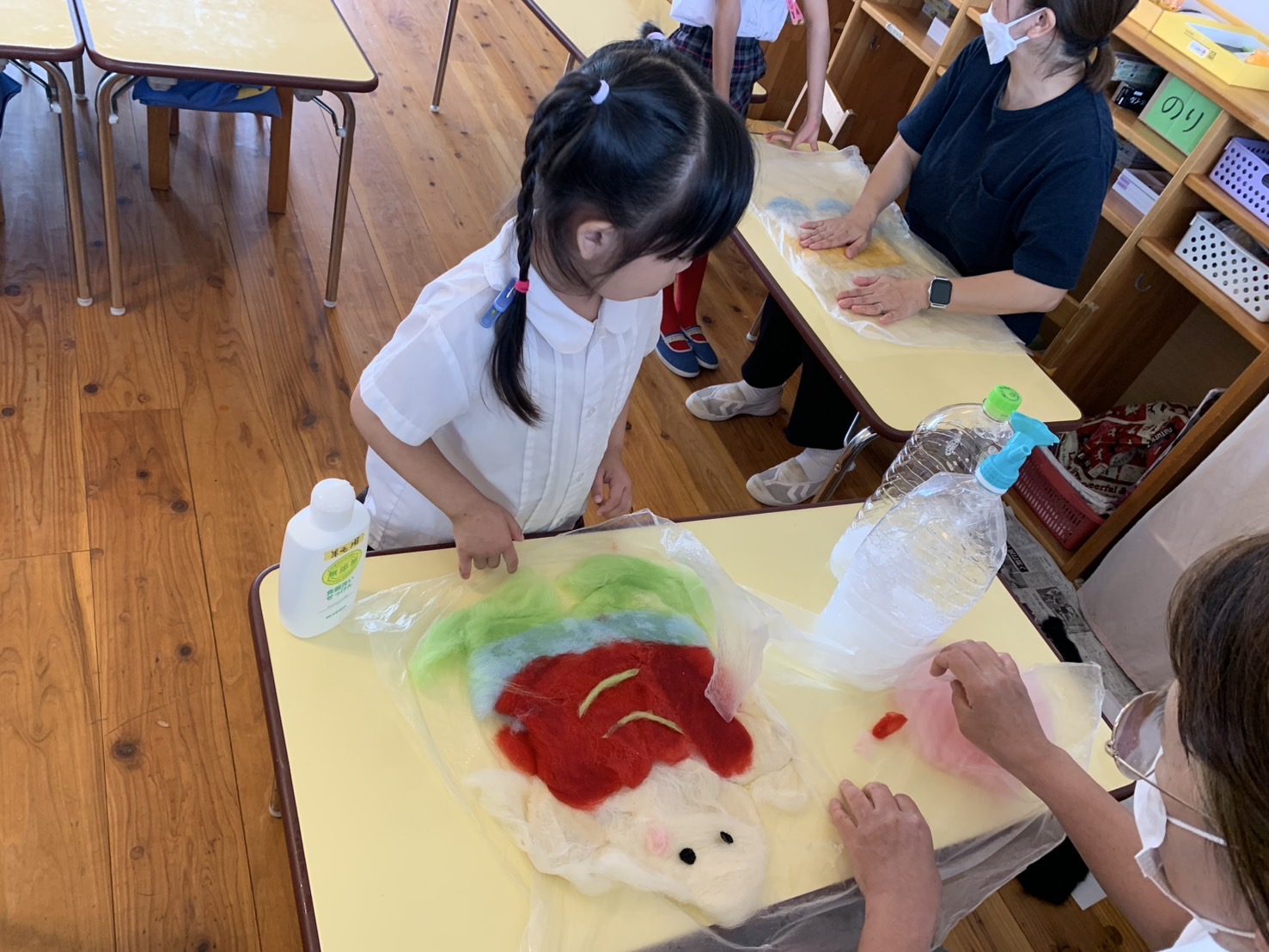自然とのつながりを感じる取り組みの1つとして、幼稚園で羊を飼い、その羊毛から身近な生活に役立つものを作っています。