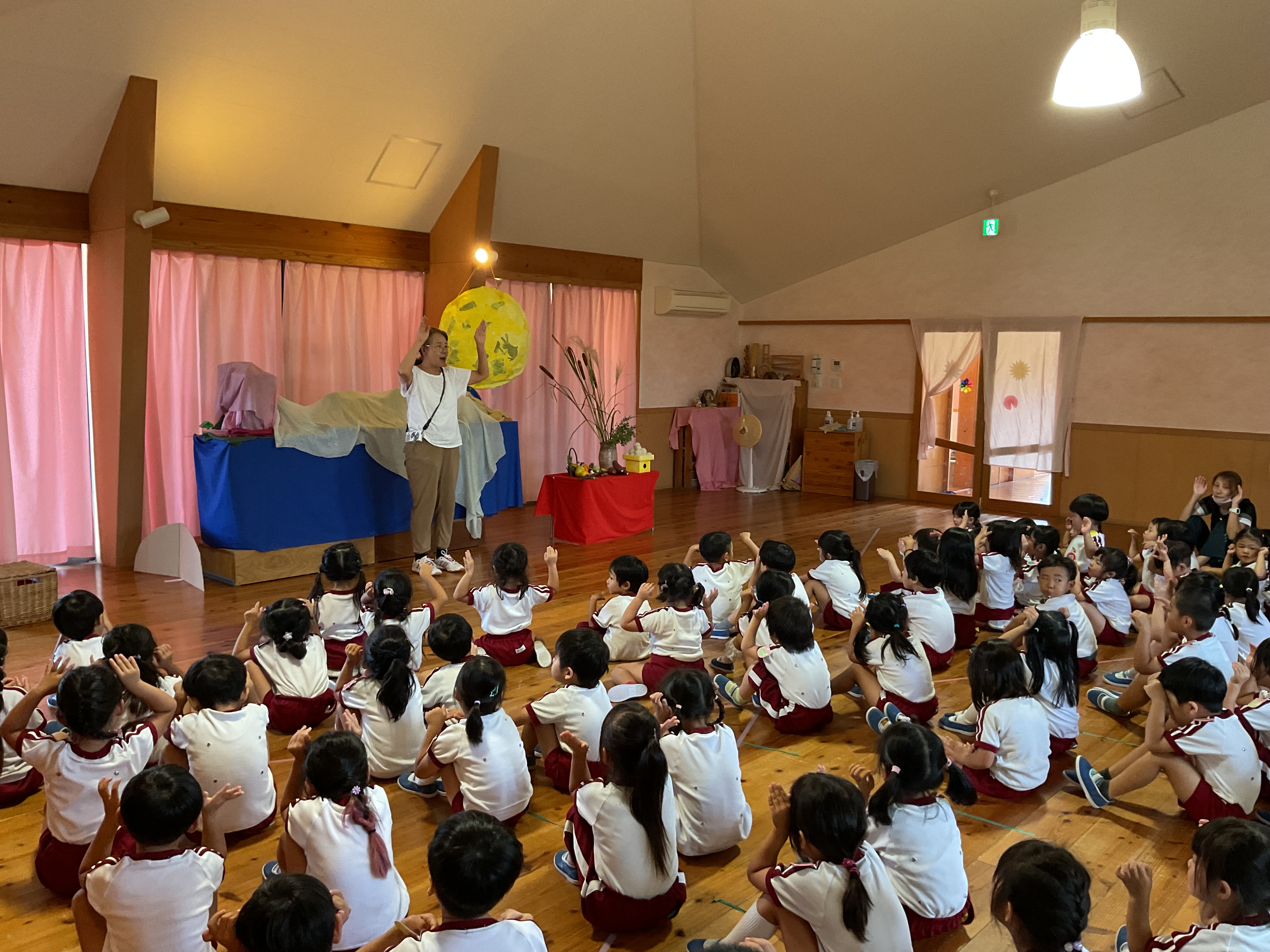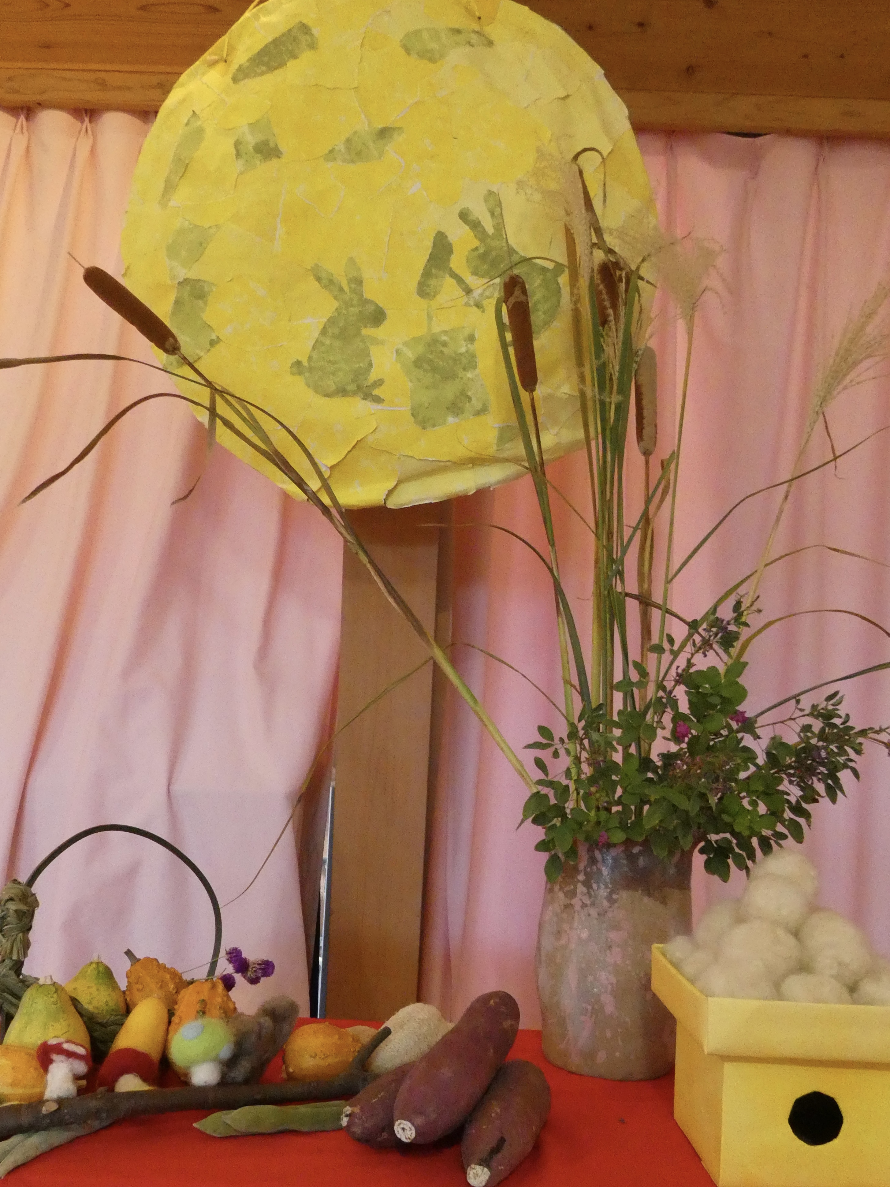 まん丸お月様にお団子やさつまいも、かぼちゃなどをお供えして、十五夜のお歌をうたったり、人形劇や紙芝居を楽しみました。