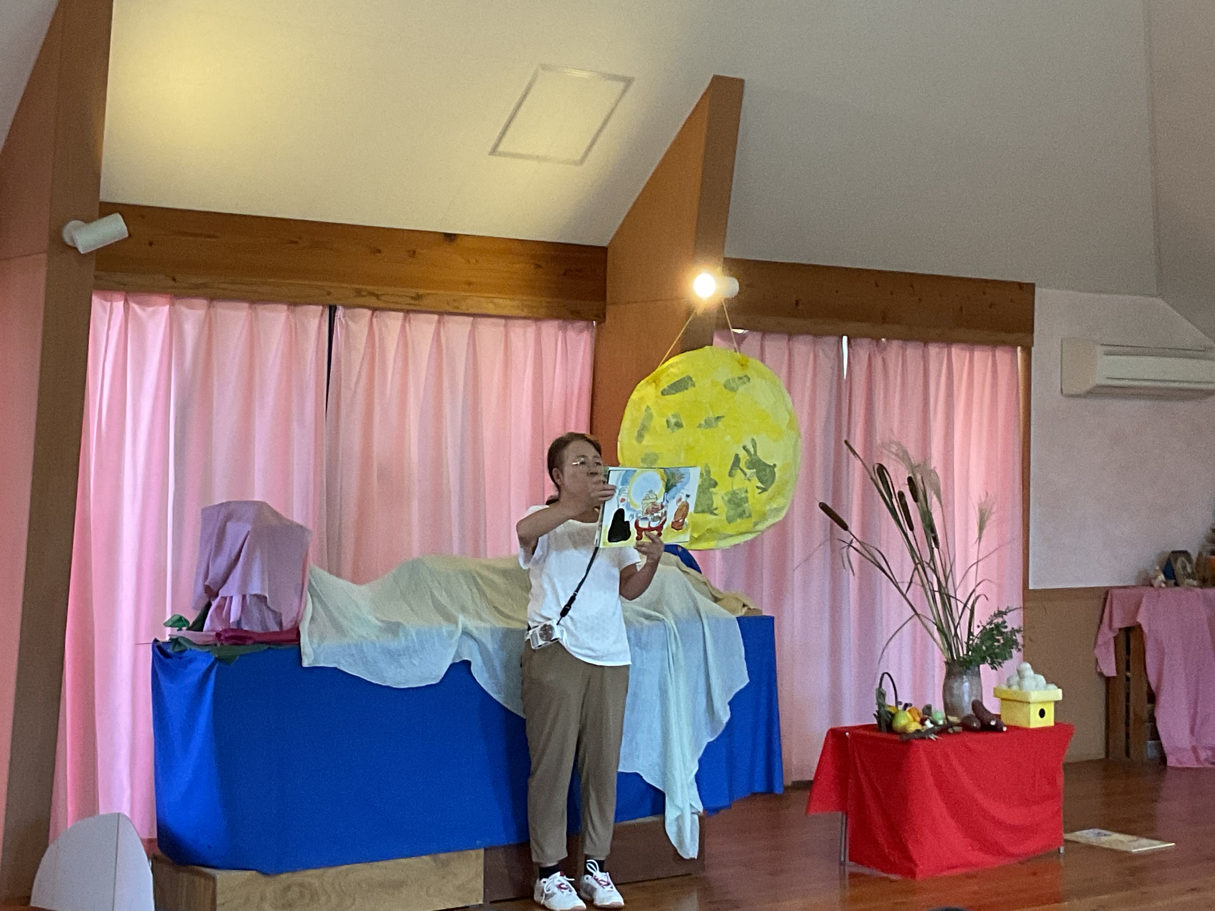 十五夜様の紙芝居も楽しみました。貧乏なおじいさんが優しくしたお坊さんにもらった刀で化け物を倒すと空から黄金が降ってきて、とても豊かになって、皆にお月見のごちそうをふるまうお話でした。