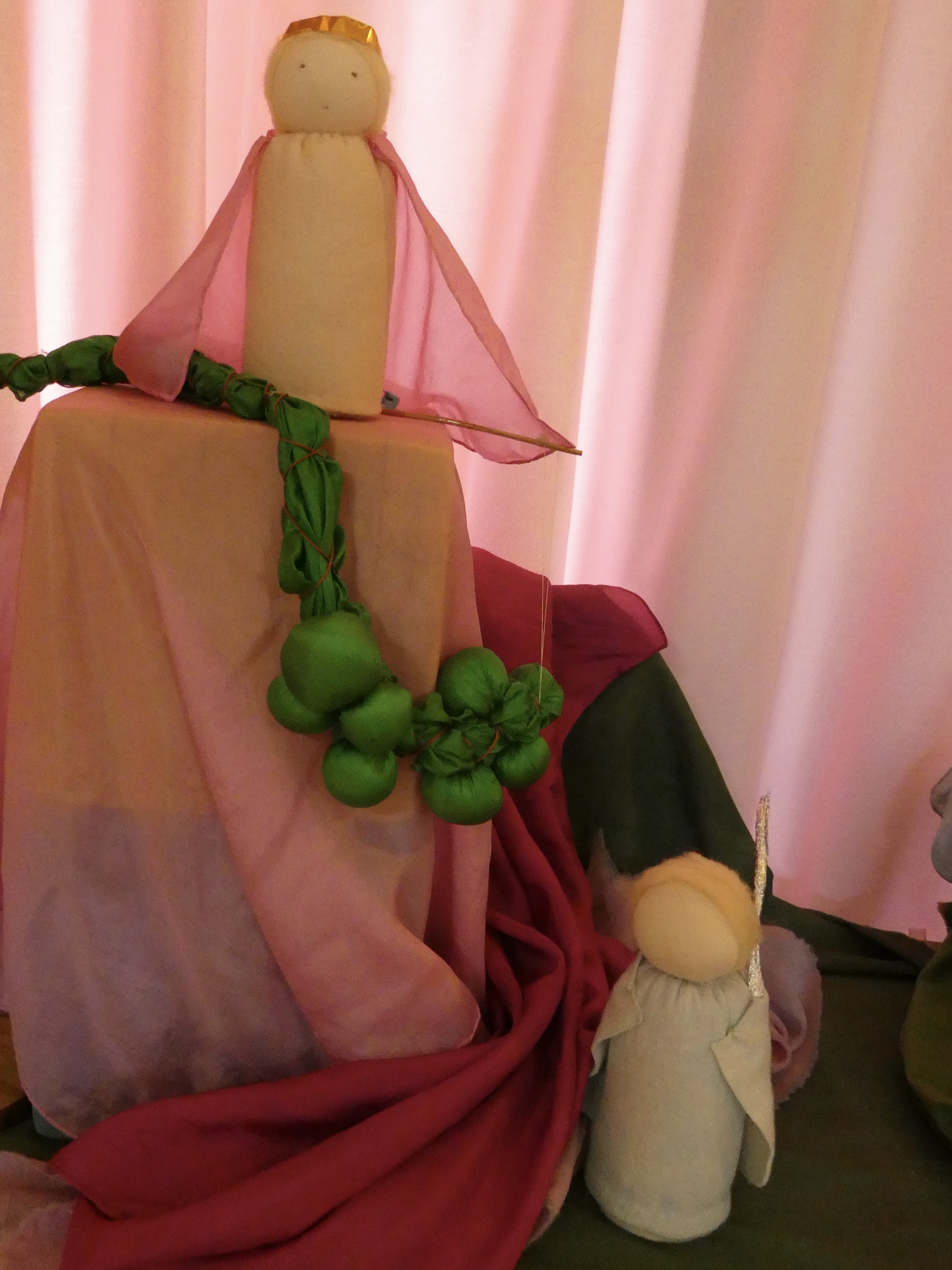今日の人形劇は『炎の城に閉じ込められたお姫様』でした。勇敢な少年が王様に頂いた鉄の剣で12の頭を持つ竜を倒して、お姫様を助けるお話。山を越え、海を越え、炎を越えて助け出しました。皆は剣で竜を倒すところがお気に入りです。